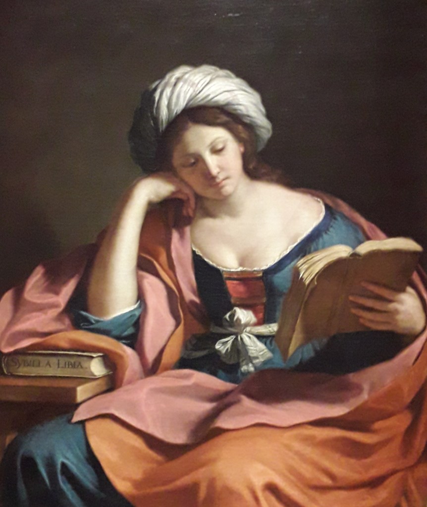 “The Libyan Sybil” (1651) by the Italian Baroque painter known as Guercino. The combination of the pink and orange in direct contrast to the blues is heavenly, and the whole rhythm of the drapes, shoulder, arm, book and hand render an enormous sense of radiant calm, most suitable for one of the prophetesses of the ancient world who foresaw the coming of Christ.