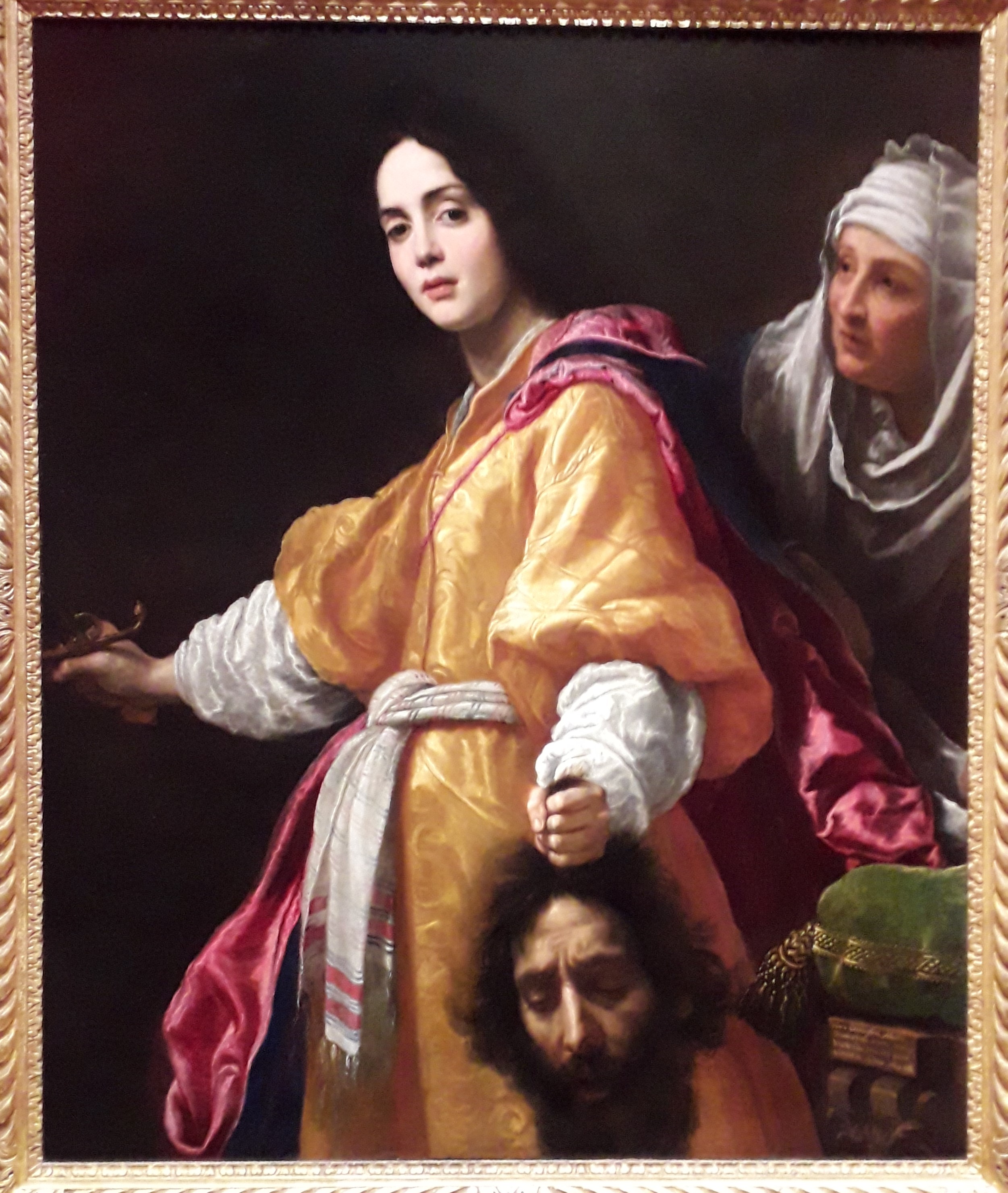 It’s said that whilst the painting is based on the classic story in which, to save her city, Judith beheads Holofernes, the leader of invading troops, it is also the autobiographical story of one of Allori’s love affairs – and that it is he who is represented as beheaded by his mistress masquerading as Judith! In turn, however, if you can avoid the head being thrust towards us, just look at that velvet mossy green, the shimmering silk pink and the embroidered yellow-gold – simply exquisite!