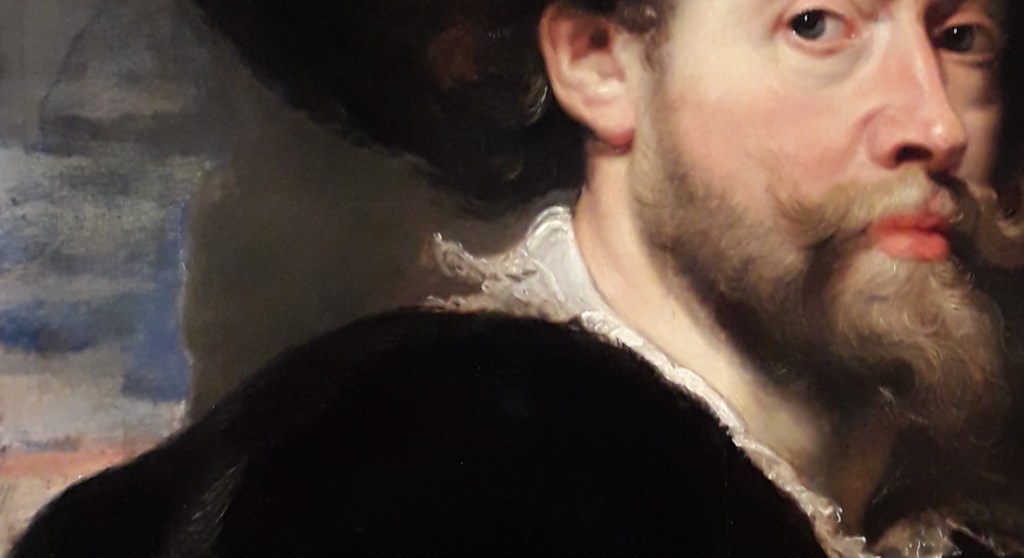 I have to say I became slightly besotted by this: the artist’s eyes have an element of intense scrutiny to them, as if nothing could ever be hidden to his sight, yet they are seemingly sympathetic, even kindly. The “info” on the gallery wall refers to students subsequently studying Rubens’ flesh tones to see how he made the features “so solid, tactile and vivacious”. However, I was more fascinated by the contrast between the perfection of the face (the delicately smooth pink and white, the fine flicks of the beard; those lips), and the roughness of the background painting just behind him where the paint is ‘raw’ in colour and texture, the canvas (almost) exposed. ‘I’m not only a gentleman and a courtier’, Rubens tells Charles (perhaps), ‘but an alchemist, a magician: I can ‘make flesh’ out of these raw materials’. It’s actually very exciting.