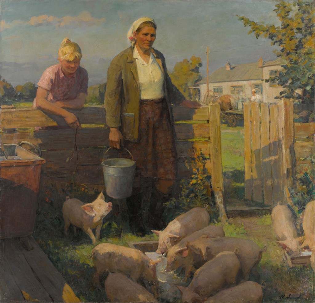 Now this might come as a surprise! Ivan Andreev’s “Pig Farm” is undated and, on sale at Sotheby‘s, sadly there are no additional notes. But surely it is from the ‘heroic’ / ‘working class impressionism’ period of 1950s Socialist Realism? Everyday life is recognised as worthy of monumental representation, the lives of the happy, healthy worker-citizens gloried in sunlight and even pig farming is an honoured part of Soviet collective productivity. Of course we can see it is ‘propaganda’: Socialist Realist artists were closely circumscribed in their art even after the demise of Stalin, both in the subject matter and style; and yet, I find there is something immensely satisfying in Andreev’s painting.