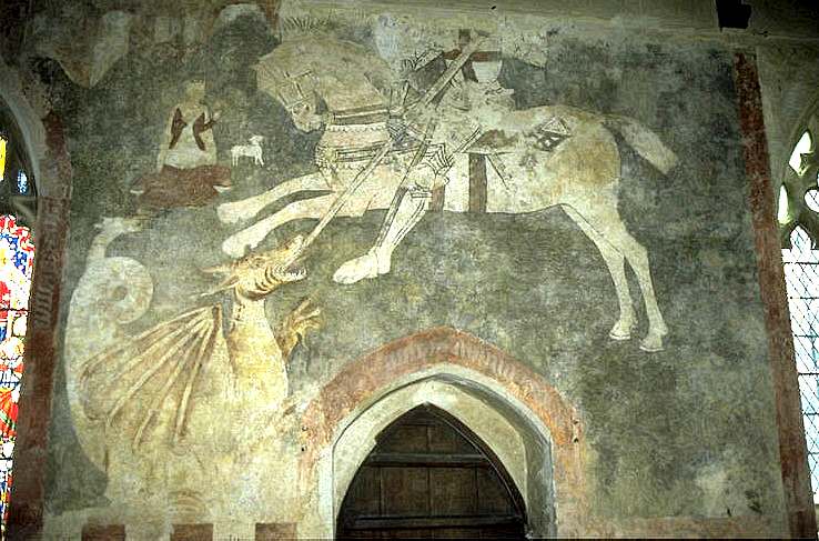 The Knight, on horseback, impales the dragon, thus securing Christian good over evil, whilst the Princess watches on along with, in the background, the King and Queen who appear to be applauding from Hadleigh Castle (which had been re/built in the 14th century).