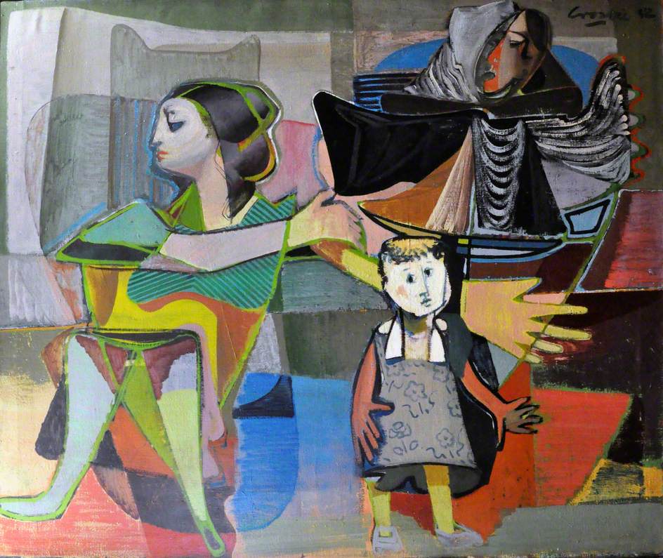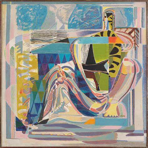 The layering and patterning of shapes through outline, colour and texture brings to mind Eileen Agar’s paintings, the ‘mother’ figure perhaps especially if we look at “Muse of Construction” [1939; c/o Christies], revealing the interaction of Cubism and Surrealism through the 1930s: