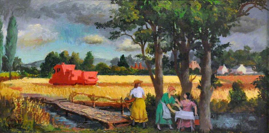 Looking through William Crosbie’s paintings at National Galleries of Scotland and artuk.org it is clear that he was brilliantly experimental, and that colour was central to his vision as the second painting of his at The Beecroft, “Hampshire Harvest” [1991; Reiff Collection], also shows. In subject matter and style (and indeed scale, for it is tiny in comparison with “Mother and Child” canvas) this is quite a contrast, but the richness of the palette is breath-taking…