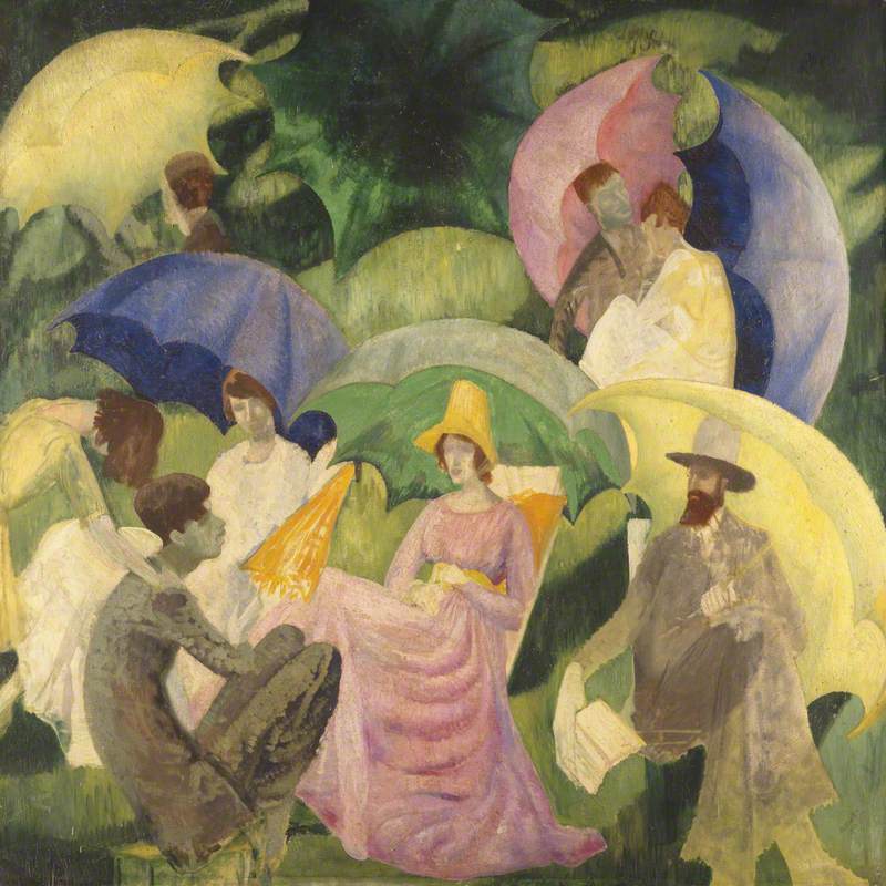 Stylised figure composition in an outdoor park setting. Group of figures in the foreground, comprising bearded man to the right beneath an ivory coloured umbrella, limply holding a book in his right hand. There is a woman in a pale pink dress and yellow hat in the centre beneath a green umbrella, seated in deckchair facing a young man in a grey suit crouching to the left. There are more figures in the background beneath coloured umbrellas to the left and right.