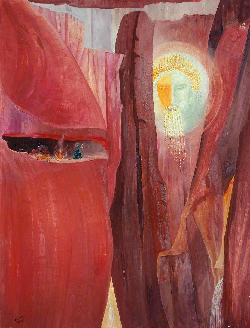 ‘The Navajo men before leaving for a hunting expedition placed their women and children in a high cave on the side of the towering cliff…. Soon after they left the Spanish soldiers rode through the Canyon. An old woman … jeered and spat, thus giving away their hiding place. The soldiers then climbed up the opposite side of the Canyon and fired into the cave until all the women and children were killed. My painting shows the dying women seeing a vision of the Sun God as they die.’ [Tate website]